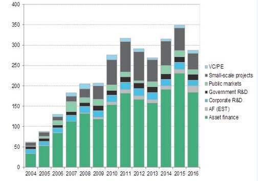 2016年,清潔能源公共市場(chǎng)投資規(guī)模達(dá)到121億美元,同比下降21%;風(fēng)險(xiǎn)投資和私募股權(quán)投資達(dá)到75億美元,同比增長(zhǎng)19%;企業(yè)清潔能源研發(fā)投入達(dá)到134億美元,同比下降21%;政府研發(fā)投入達(dá)到141億美元,同比增長(zhǎng)8%。