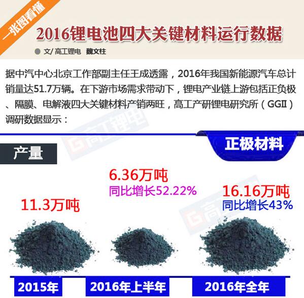 中國儲能網(wǎng)訊:據(jù)中汽中心北京工作部副主任王成透露,2016年我國新能源汽車總計銷量達51.7萬輛。在下游市場需求帶動下,鋰電產(chǎn)業(yè)鏈上游包括正負極、隔膜、電解液四大關鍵電池材料產(chǎn)銷兩旺。