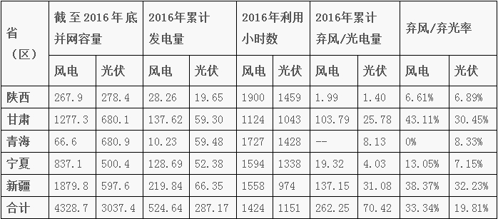 2016年,西北五?。▍^(qū))新增光伏發(fā)電并網容量1011萬千瓦,截至2016年年底,累計并網容量3037萬千瓦,占全網總裝機的13.8%。2016年,光伏發(fā)電量287.17億千瓦時,占全網總發(fā)電量的4.57%;利用小時數1151小時,棄光電量70.42億千瓦時,棄光率19.81%。西北五省(區(qū))中,新疆、甘肅光伏發(fā)電運行較為困難,棄光率為32.23%和30.45%。此外,寧夏棄光率7.15%,青海棄光率8.33%,陜西首次發(fā)生棄光限電情況,棄光率為6.89%。