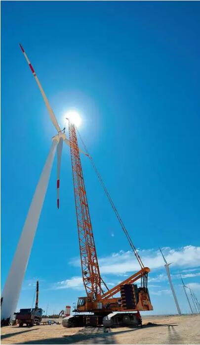 2015年6月5日,工人在新疆哈密煙墩第七風(fēng)電場進(jìn)行風(fēng)機(jī)吊裝 李華/攝