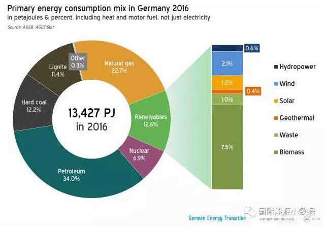 2016年德國一次能源消費總量為13,427PJ(約3.21億噸標準油),其中石油占34.0%,煤炭占23.6%,天然氣占22.7%,核能占6.9%,其他可再生能源合計占12.6%(生物質及垃圾8.5%,風能2.1%,太陽能1.2%,水電0.6%,地熱0.4%)。由此可見,目前化石能源仍占德國一次能源消費的80%。