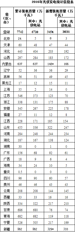 *注:2015年內(nèi)蒙古、新疆的分布式發(fā)電統(tǒng)計(jì)數(shù)據(jù)存在誤差,分別為18萬和4萬千瓦,在本表數(shù)據(jù)中進(jìn)行了相應(yīng)核減,故兩省新增裝機(jī)容量小于其光伏電站裝機(jī)容量。
