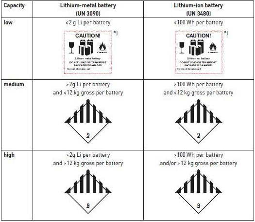 以常見的鋰離子電池為例,容量100Wh或以下的電池為低容量,100Wh以上但重量小于或等于12kg的電池為中容量,100Wh以上且/或重量大于12kg的為高容量。