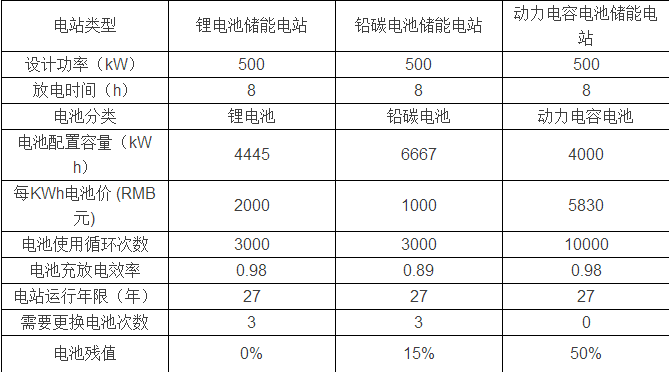 中國(guó)儲(chǔ)能網(wǎng)訊:現(xiàn)以三種不同電池,按照500kW-8h(4000kWh)儲(chǔ)能電站,分別比較儲(chǔ)能電站成本與效益。見(jiàn)下表1~表2。