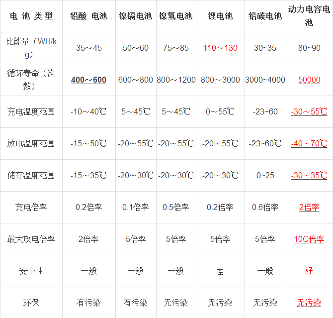 由上表可以看出動(dòng)力電容電池在多種性能上是優(yōu)于如今的主流電池的。
