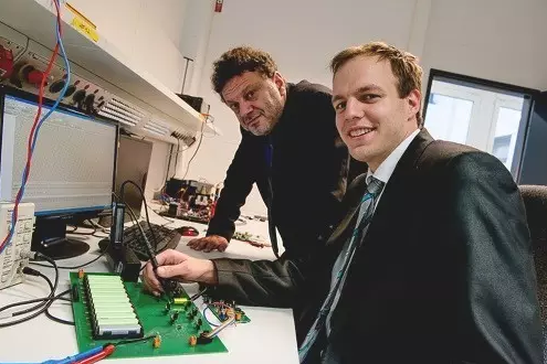 電動(dòng)車輛電池可能會(huì)變得更輕,更便宜,這得益于在德國(guó)波鴻魯汶大學(xué)康斯坦丁諾斯Sourkounis教授(左)的指導(dǎo)下,由工程學(xué)生PhilipDost(右)組成的團(tuán)隊(duì)開發(fā)的新傳感器技術(shù)。(來(lái)源:Ruhr-Universit?tBochum)