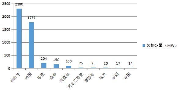 國際可再生能源署(IRENA)統(tǒng)計數(shù)據(jù)顯示,截至2015年12月底,西班牙在運光熱電站總裝機容量為2300MW,占全球總裝機容量近一半,位居世界第一;美國總裝機量為1777MW,位列世界第二;兩者合計光熱裝機超過4GW,約占全球光熱裝機的88%。其后是印度、南非、阿聯(lián)酋、阿爾及利亞、摩洛哥等國。