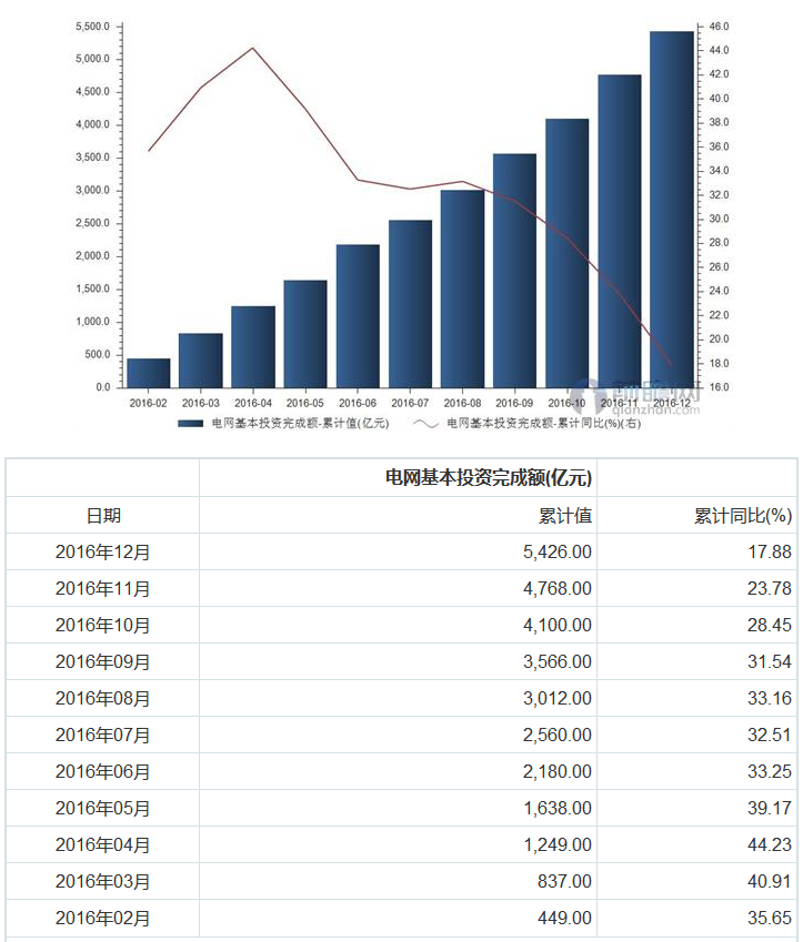 以下為2016年我國電網(wǎng)基本投資完成額累計值統(tǒng)計: