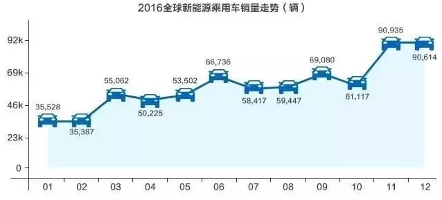中國(guó)儲(chǔ)能網(wǎng)訊:據(jù)高工數(shù)據(jù)庫——電動(dòng)車數(shù)據(jù)庫顯示,2016年全球新能源乘用車銷量達(dá)到726,050輛。其中11月、12月分別達(dá)到90,935輛、90,614輛,占全年銷量的25%。