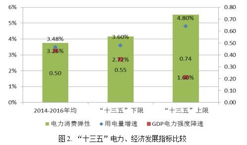 自從2014年我國步入新常態(tài),電力消費彈性的下降表現得更為明顯。從近3年來看(2014-2016年),GDP年均增速約6.97%,用電量年均增速3.48%,以此核算出的電力消費彈性系數約為0.5。按照“十三五”電力規(guī)劃中的電力需求展望,未來5年年均增速3.6%-4.8%,增速下限對應的電力彈性約0.55,上限對應的電力消費彈性約0.74。按經濟進入新常態(tài)后的調整態(tài)勢看,若整個“十三五”期間電力彈性比前三年還有所反彈,顯然是明顯違背規(guī)律和政策預期的。另從GDP電力強度的下降速度來看,近三年GDP電力強度年均下降速度約3.26%,按需求增速下限對應的GDP電力強度年均降速約為2.72%,與近三年的趨勢較為一致;而若按需求增速上限看,GDP電力強度年均降速為1.6%,相比前三年顯著放緩,這與新常態(tài)下以第三產業(yè)和戰(zhàn)略新興產業(yè)為主的經濟增長動力顯然不符。由此來看,“十三五”期間電量增長達到上限增速(4.8%)顯然不太可能,而3.6%的下限預期可能性更大。