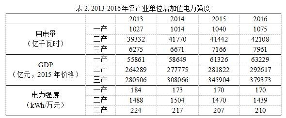為更好地把握“十三五”期間電力需求態(tài)勢,本文對于近4年(2013-2016年)三次產業(yè)的增加值電力強度做進一步分析??傮w來看,三大產業(yè)的電力強度均呈現下降的趨勢,盡管出現個別年份出現小幅反彈的情況,但是總體依舊處于下降通道。