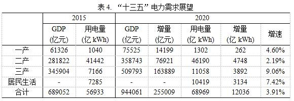 根據“十三五”規(guī)劃綱要的發(fā)展目標,“十三五”期間GDP年均增速要保持在6.5%以上,預計到2020年,我國GDP總量將達到94.4萬億元。結合電力發(fā)展規(guī)劃目標,預計“十三五”我國電力消費彈性系數約為0.74。由表2中的數據可以看出,以電力消費彈性這一指標來看,從“十五”到“十三五”,該指標一直呈下降趨勢。然而,“十三五”期間電力彈性能否維持0.74的水平,這仍然是一個值得深思的問題;也就是說“十三五”期間,年均4.8%甚至更高的用電量增速是值得深究的。