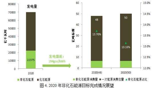 從非化石能源目標來看,根據“十三五”電力規(guī)劃,預計2020年我國非化石能源發(fā)電量為2.24萬億千瓦時。按照310gce/kWh的供電煤耗目標(對應的發(fā)電煤耗水平約294gce/kWh)核算,非化石電力生產對應的一次能源供應量為約6.6億噸標煤。按照50億噸標準煤的一次能源消費預期目標來計算,電力非化石一次能源占比僅為13.2%,15%的非化石能源占比目標料難完成。我們考慮2020年50億噸標煤的一次能源消費量目標可能過于樂觀;但即便是按照較為合理的48億噸標準煤來計算,電力非化石能源在一次能源中的占比也僅為13.7%,與15%的目標仍有較大差距。