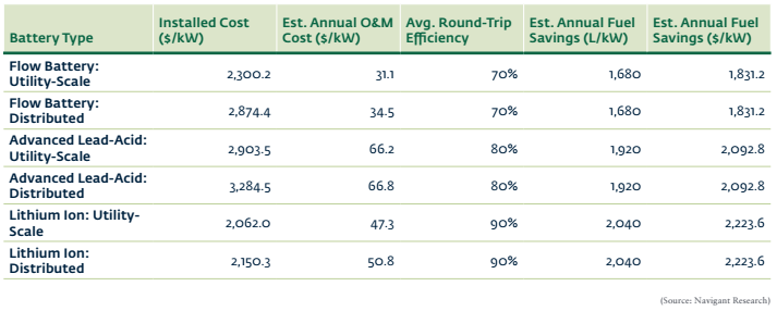 報告中特別指出,除了電網(wǎng)基礎(chǔ)設(shè)施依靠儲能系統(tǒng)可以提供更多的服務(wù)外,偏遠地區(qū)的微電網(wǎng)還因儲能系統(tǒng)的接入而極大地降低了對柴油發(fā)電的依賴性。在年度節(jié)油方面,公共事業(yè)規(guī)模儲能和分布式鋰離子儲能都比燃油具有更明顯的優(yōu)勢,安裝成本分別是2062美元/kW和2150.3美元/kW,節(jié)油成本均達到2223.6,美元/kW。