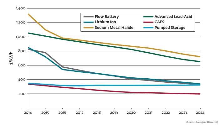 2014-2024全球公共事業(yè)規(guī)模儲能系統(tǒng)成本發(fā)展趨勢(按技術(shù)類型)