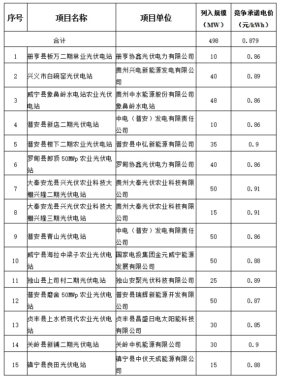 中國儲能網(wǎng)訊:根據(jù)《國家能源局關(guān)于調(diào)整2016年光伏發(fā)電建設規(guī)模有關(guān)問題的通知》(國能新能〔2016〕383號)文件精神和《貴州省普通光伏電站項目競爭性配置實施辦法(試行)》的要求,2016年貴州省普通光伏發(fā)電項目追加建設規(guī)模競爭性配置工作,采取企業(yè)自主競價等相關(guān)競爭性要求申報項目、第三方機構(gòu)評選的方式進行優(yōu)選,共有23個項目申報參與競爭性評選,總裝機規(guī)模98萬千瓦。經(jīng)過第三方機構(gòu)評選,共有15個項目獲得優(yōu)選配置規(guī)模,追加總規(guī)模為49.8萬千瓦,經(jīng)國家能源局同意,現(xiàn)予公布。