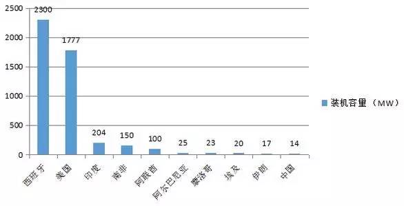 國際可再生能源署(IRENA)統(tǒng)計(jì)數(shù)據(jù)顯示,截至2015年12月底,西班牙在運(yùn)光熱電站總裝機(jī)容量為2300MW,占全球總裝機(jī)容量近一半,位居世界第一;美國總裝機(jī)量為1777MW,位列世界第二;兩者合計(jì)光熱裝機(jī)超過4GW,約占全球光熱裝機(jī)的88%。其后是印度、南非、阿聯(lián)酋、阿爾及利亞、摩洛哥等國。