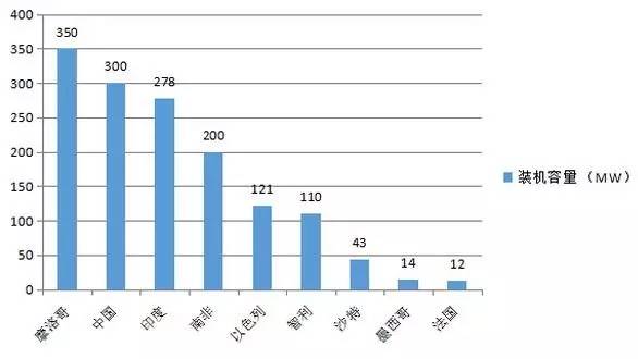 各國在建太陽能光熱發(fā)電站裝機(jī)容量(截至2016年2月)