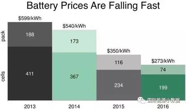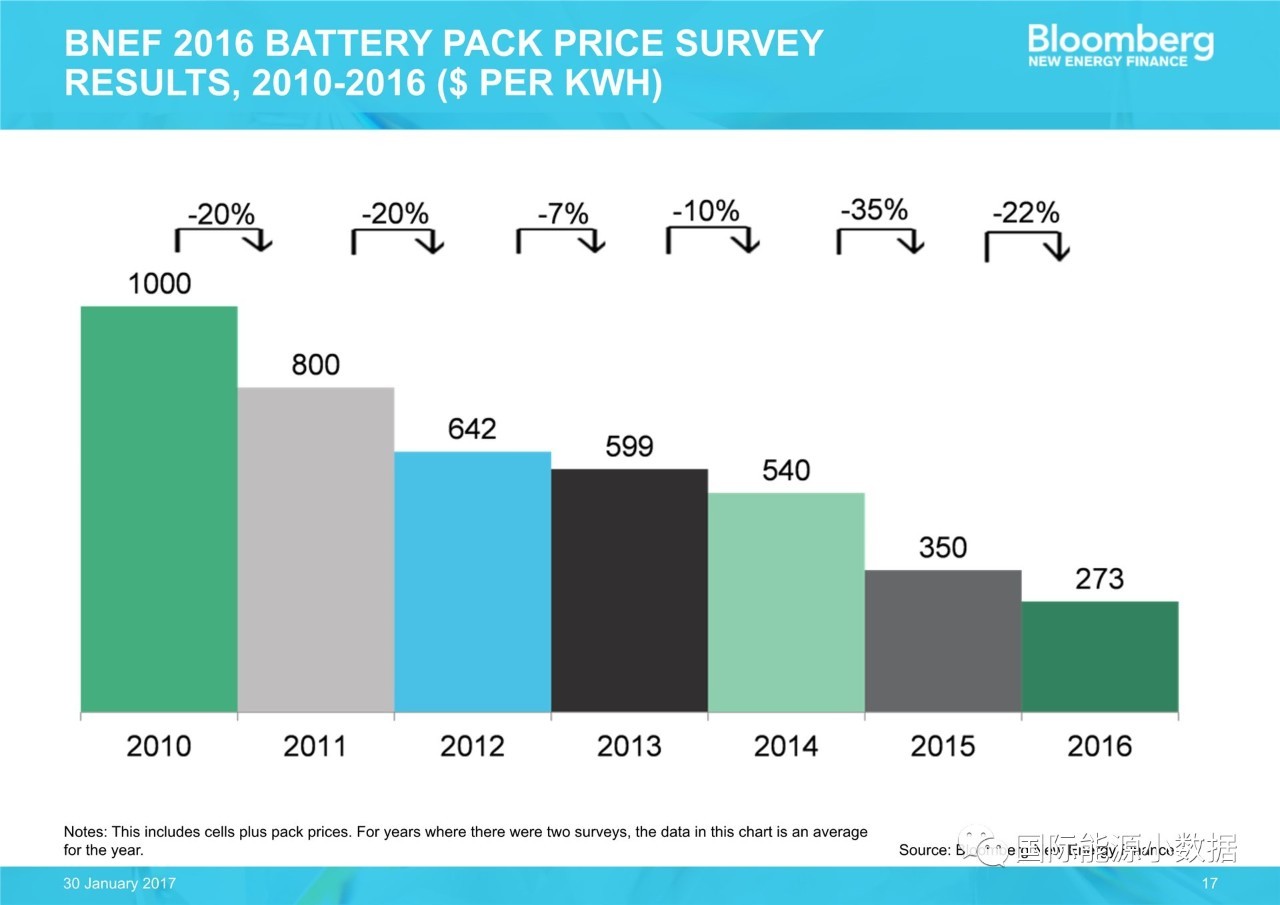中國儲能網(wǎng)訊:根據(jù)彭博新能源財經(jīng)的調(diào)查統(tǒng)計,鋰電池儲能系統(tǒng)價格自2010年以來持續(xù)下跌。2013年到2016年超過一半,從599美元/KWh(其中電池成本411美元/KWh)跌至2016年的273美元/KWh(其中電池成本199美元/KWh)。