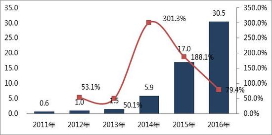 圖 2011-2016年中國鋰動(dòng)力電池出貨量:Gwh
