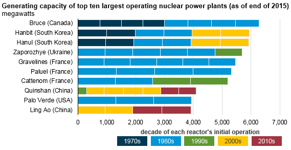 近年來,全球十大核電站名單發(fā)生了變化。日本的三座核電站已不在名單之上。這三座核電站每座發(fā)電容量超過4000兆瓦,在福島第一核電站事故后停止運(yùn)行。而中國兩座核電站躋身十大核電站新名單,分別是秦山核電站和嶺澳核電站。中國正在增建大型核電站。例如,2015年底,位于中國大連附近的紅巖河核電站容量為3183兆瓦,但隨著2016年另一個1000兆瓦的反應(yīng)堆的啟動,該電站當(dāng)前容量達(dá)4183兆瓦,此外還有兩座反應(yīng)堆在建中。