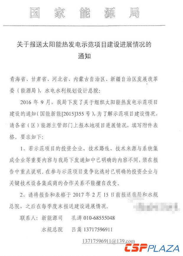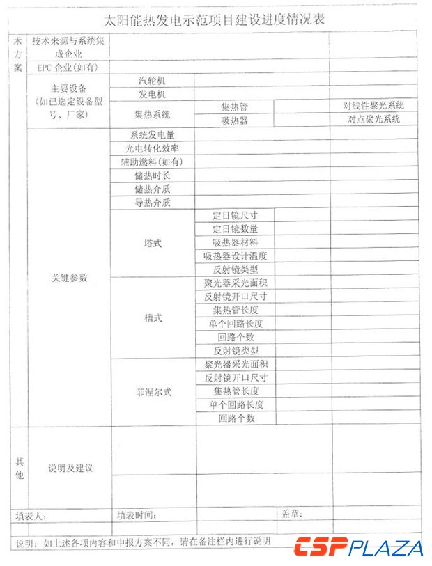 通知要求于2月15日之前將隨通知下發(fā)的太陽能熱發(fā)電示范項目建設進度情況表(見附件)填寫完畢后報送至國家能源局新能源和可再生能源司及水規(guī)總院,此后于每個季度末報送項目建設進展情況。