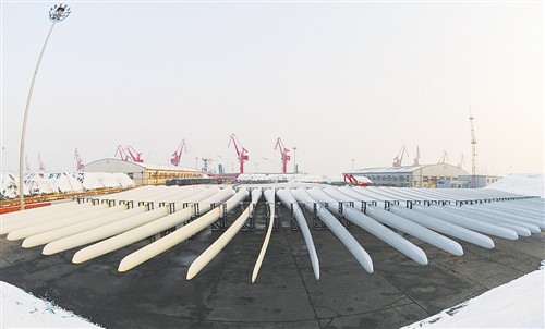 2月1日,一批國(guó)產(chǎn)風(fēng)電葉片在江蘇連云港港口碼頭集結(jié)等待裝船出口。