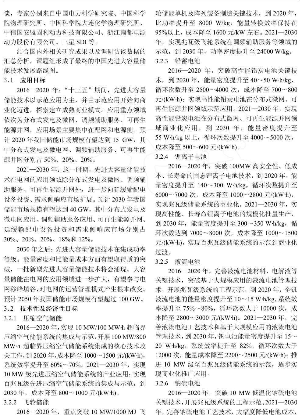 本文著眼于電網(wǎng)應(yīng)用,首先分析了儲能技術(shù)及發(fā)展現(xiàn)狀,其次分析了先進(jìn)大容量儲能技術(shù)及其技術(shù)經(jīng)濟(jì)特性,在此基礎(chǔ)上,采用專家研討會、調(diào)查問卷或面訪等多種形式,結(jié)合國內(nèi)外相關(guān)研究成果以及調(diào)研訪談數(shù)據(jù),從儲能技術(shù)應(yīng)用規(guī)模、技術(shù)特性、經(jīng)濟(jì)性等方面,提出2016—2020、2021—2030及2030年以后我國適用于電網(wǎng)的先進(jìn)大容量儲能技術(shù)發(fā)展路線圖。
