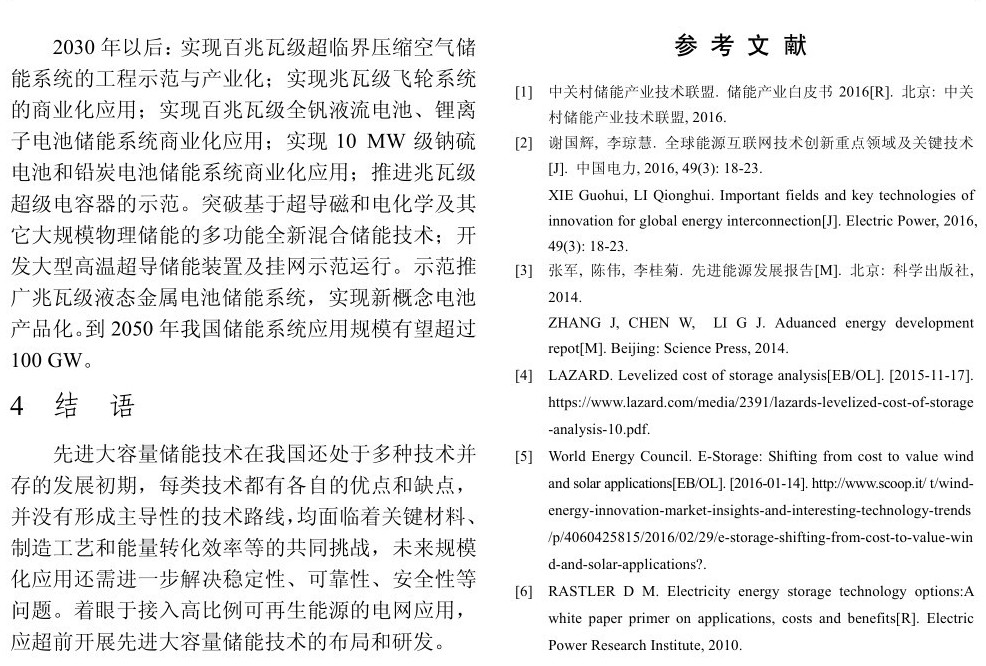 先進(jìn)大容量儲能技術(shù)在我國還處于多種技術(shù)并存的發(fā)展初期,每類技術(shù)都有各自的優(yōu)點和缺點,并沒有形成主導(dǎo)性的技術(shù)路線,均面臨著關(guān)鍵材料、制造工藝和能量轉(zhuǎn)化效率等的共同挑戰(zhàn),未來規(guī)?;瘧?yīng)用還需進(jìn)一步解決穩(wěn)定性、可靠性、安全性等問題。著眼于接入高比例可再生能源的電網(wǎng)應(yīng)用,應(yīng)超前開展先進(jìn)大容量儲能技術(shù)的布局和研發(fā)。
