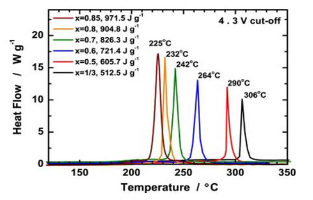 而且隨著NCM能量密度的不斷提高,材料的熱穩(wěn)定性會越來越差。下圖表述的是隨著Ni含量的升高材料的分解溫度逐漸下降。
