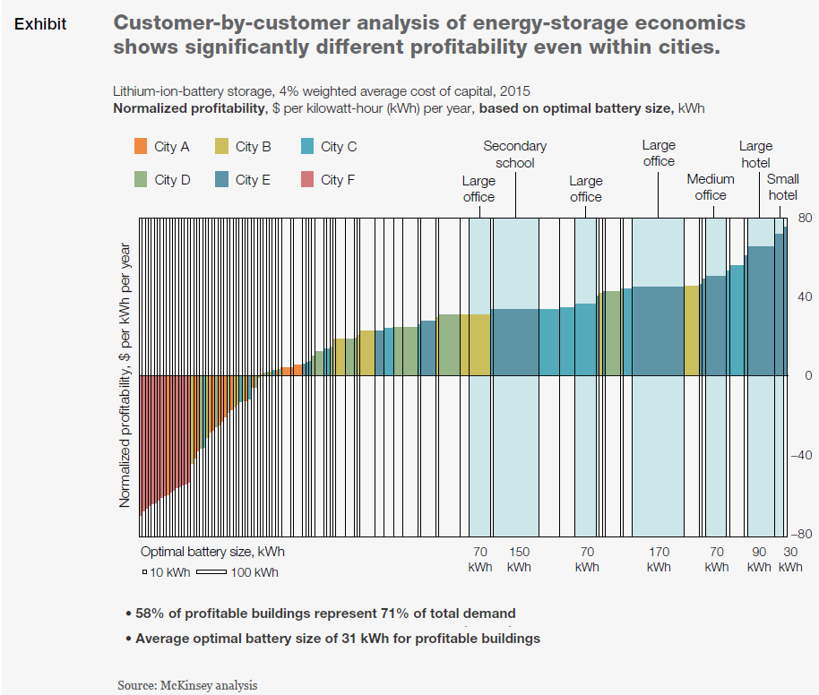 麥肯錫評估了3-4個不同地區(qū)的14個特定的應(yīng)用場景,評估在市場進(jìn)入時提供能夠提供具有吸引力的早期回報的應(yīng)用場景。接著,又分析了用戶側(cè),工商業(yè)的不同用戶類型,并分析在什么樣的費率結(jié)構(gòu)下,在是否是分時電價,不同的費率層級,是否有需求電費等情況下,儲能是經(jīng)濟性的。