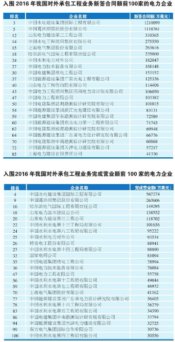從榜單上可以看到,“2016年我國對外承包工程業(yè)務(wù)完成營業(yè)額前100家企業(yè)”中,電力建設(shè)相關(guān)企業(yè)占到24家,而且榜單前30名中就有10家企業(yè);“2016年我國對外承包工程業(yè)務(wù)新簽合同額前100家企業(yè)”中,電力相關(guān)企業(yè)占到22家,前30名中有9家。