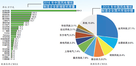 與此同時(shí),截至2016年底,有五家整機(jī)制造企業(yè)的累計(jì)裝機(jī)容量超過(guò)1000萬(wàn)千瓦,五家市場(chǎng)份額合計(jì)達(dá)到55.9%;其中金風(fēng)科技累計(jì)裝機(jī)容量達(dá)到3748萬(wàn)千瓦,占國(guó)內(nèi)市場(chǎng)的22.2%。