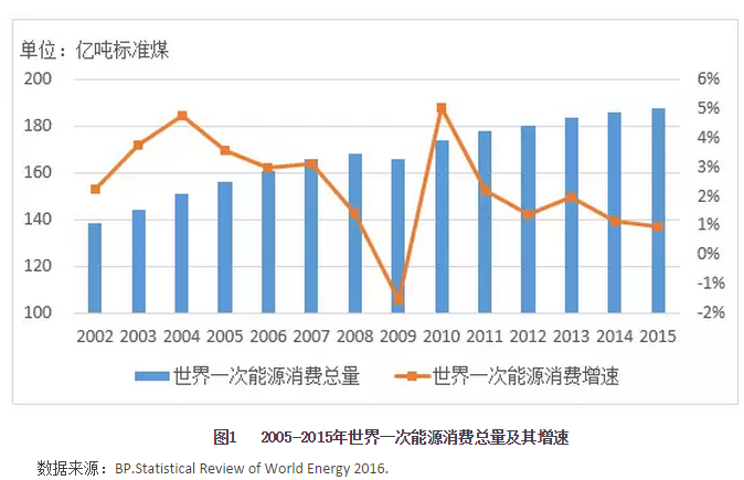 2012年以來,全球能源消費增速顯著趨于放緩。根據(jù)BP統(tǒng)計數(shù)據(jù),2012年之前的10年間,世界一次能源消費總量由2002年的138.8億噸標(biāo)準(zhǔn)煤增加到2012年的180.3億噸標(biāo)準(zhǔn)煤,年均增加近4.2億噸標(biāo)準(zhǔn)煤,年均增速為2.7%。這一時期較快增長的能源需求主要由高速發(fā)展的中國經(jīng)濟所拉動,10年間中國能源消費量增加了23.4億噸標(biāo)準(zhǔn)煤,占同期世界能源消費總增加量41.5億噸標(biāo)準(zhǔn)煤的56.4%。從2012年開始,世界能源需求呈現(xiàn)疲軟態(tài)勢,增速逐步放緩,2012年、2013年、2014年和2015年世界一次能源消費增速分別為1.4%、2.0%、1.1%和1.0%,顯著低于之前10年2.7%的年均增速(如圖1所示)。導(dǎo)致這一現(xiàn)象的原因主要有兩個:一是發(fā)達(dá)國家在經(jīng)歷2007、2008年金融危機后,經(jīng)濟尚未完全復(fù)蘇,能源需求疲軟。以北美、歐洲及歐亞地區(qū)為例,2015年北美一次能源消費量為39.9億噸標(biāo)準(zhǔn)煤,盡管與2012年相比略微增加,但仍低于2008年40.3億噸標(biāo)準(zhǔn)煤的消費量;歐洲及歐亞地區(qū)2015年一次能源消費量為40.5億噸標(biāo)準(zhǔn)煤,相比于2008年下降了6.2%[1]。二是新興市場國家經(jīng)濟增速放緩及產(chǎn)業(yè)結(jié)構(gòu)調(diào)整降低了能源需求增速。其中最具有代表的是中國,隨著經(jīng)濟發(fā)展進(jìn)入新常態(tài),產(chǎn)業(yè)結(jié)構(gòu)的深度調(diào)整和持續(xù)升級使得能耗較高的重工業(yè)在經(jīng)濟總量中所占的比重持續(xù)下降,能源需求進(jìn)入低速增長階段。中國的消費增速由2011年的7.3%下降到2015年的0.9%,趨近于世界平均水平[2]。另外,根據(jù)BP的統(tǒng)計數(shù)據(jù),中國能源消費的增長量占世界總增長量的比例由2011年的74.5%降到2015年的34.4%,對能源需求總量的拉動作用明顯減弱。