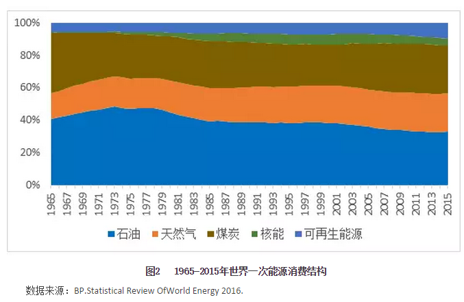 到目前為止,以煤炭、石油和天然氣為代表的化石能源在能源消費中的主體地位仍不可撼動,但其內(nèi)部結(jié)構(gòu)卻在不斷發(fā)生變化。自第二次工業(yè)革命以來,化石能源的消費量急劇上漲,起初形成了以煤炭為主的消費格局。進(jìn)入20世紀(jì)以后,尤其是第二次世界大戰(zhàn)以來,石油和天然氣的消費量持續(xù)增加,石油取代了煤炭成為最主要的能源。根據(jù)BP統(tǒng)計數(shù)據(jù),石油占世界一次能源消費量的比重在1973年達(dá)到峰值(占比48.7%)后逐年降低,到2015年,石油占比為32.9%;天然氣所占份額不斷提升,由1965年的15.8%上升到2015年的23.9%,提高了約8個百分點;煤炭的占比在1999年降到最低點后(約25%),又出現(xiàn)小幅回升,近幾年占比維持在30%左右;核能的占比在經(jīng)歷了短暫上升后又開始下滑,到2015年占比不到4.5%;可再生能源的消費量在過去幾十年間一直穩(wěn)步增加(主要以水電為主),所占比重由1965年的5.6%上升到2015年的9.6%,提高了4個百分點(如圖2所示)。由此可見,迄今為止,石油仍然是最重要的能源。另外,化石能源內(nèi)部此消彼長,它占世界一次能源消費量的比重一直維持在85%以上,核能以及可再生能源的占比依舊很小。