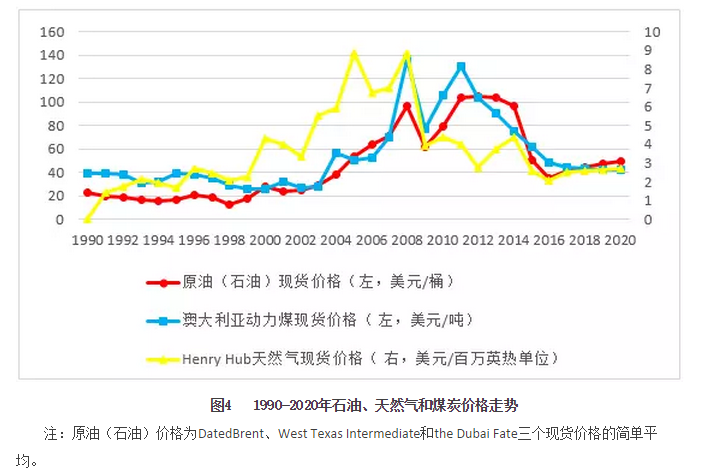 在能源價格中,油價具有典型的代表意義。一方面因為在眾多領(lǐng)域中用到的燃料和產(chǎn)品大多來自于石油。另一方面,煤炭的價格一直以來受到石油價格的直接影響,走勢大致相同;近幾年來,天然氣價格似乎已經(jīng)擺脫了隨油價而波動的趨勢(如圖4所示),然而與石油不同,天然氣尚未形成全球性的統(tǒng)一市場,北美、歐洲和亞太這三大天然氣市場氣價形成機制不同,導(dǎo)致價格存在明顯的差異(圖中采用的是北美HenryHub天然氣現(xiàn)貨價格,遠(yuǎn)低于亞洲LNG市場價格)。從石油價格來看,在1990年到2002年期間,石油價格相對平穩(wěn),基本維持在20美元/桶左右;從2003年到2008年,石油價格由28.9美元/桶飆升至97.0美元/桶;受2008年金融危機的影響,2009年石油價格達(dá)到局部最低點,此后又開始回升,到2012年,達(dá)到歷史最高點-105.0美元/桶;2013年到2015年,石油價格由104.0美元/桶跌至50.8美元/桶,年均每桶下降26.6美元。煤炭的價格走勢基本與石油同步,在經(jīng)歷了2009年價格下跌之后,2011年又重新回到每噸130.1美元的價格高點,之后一直到2015年,煤炭的價格不斷下跌。天然氣的價格在2012年短暫的擺脫了隨油價波動的趨勢,然而從2014年開始,又隨著石油價格的降低而降低。由此可見,當(dāng)前受全球能源供過于求的影響,能源價格持續(xù)低迷。