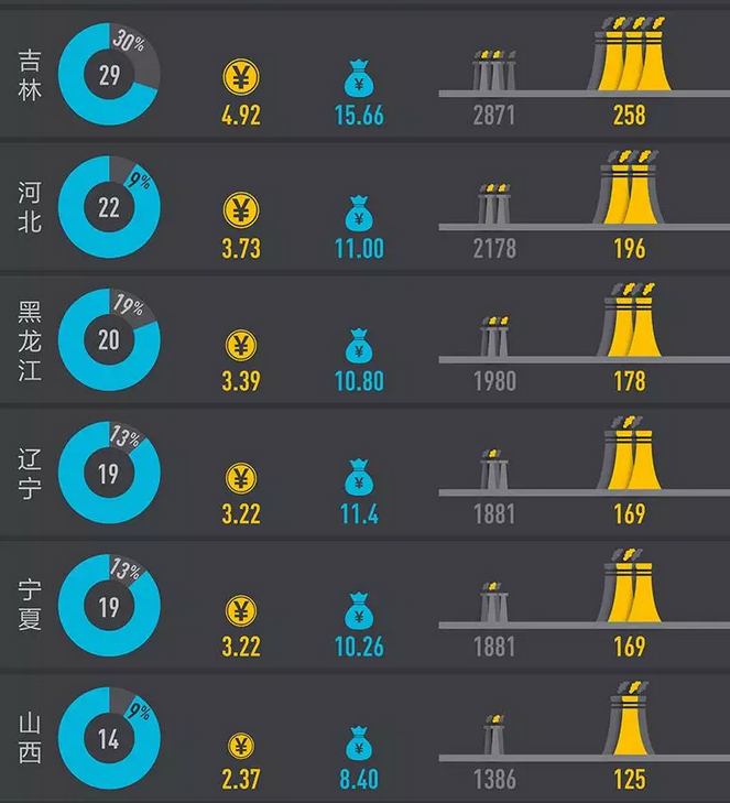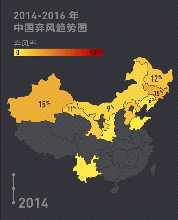 2014至2016年,中國(guó)部分地區(qū)棄風(fēng)呈攀升趨勢(shì),日益惡化:2016年棄風(fēng)總量高達(dá)497億千瓦時(shí),是2014年的4倍!上圖中顏色最深的甘肅、新疆、內(nèi)蒙古、吉林和黑龍江五個(gè)地區(qū),3年棄風(fēng)量就接近800億千瓦時(shí),相當(dāng)于天津市2015年全年的用電量。其中,甘肅省的棄風(fēng)率更是從2014的11%飆升到2015年的43%!