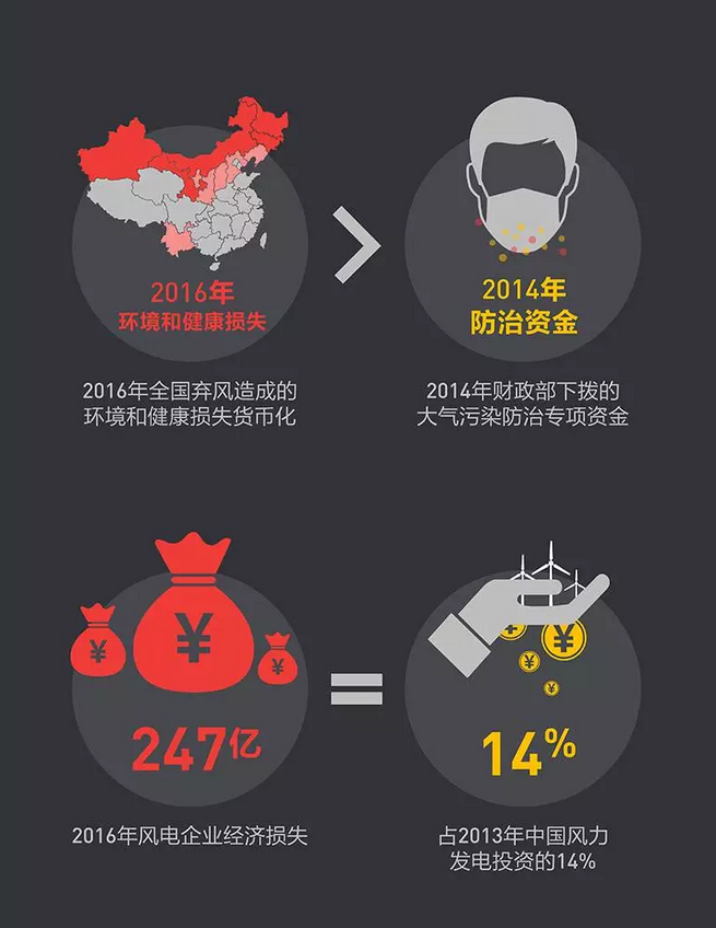 在上面這張圖中,根據(jù)2014至2016年中國(guó)棄風(fēng)數(shù)據(jù),化“無(wú)形”為“有形”,計(jì)算了由燃煤發(fā)電取代的這部分棄風(fēng)電量對(duì)生態(tài)環(huán)境、人體健康和社會(huì)經(jīng)濟(jì)等各方面的損害,具體包括: