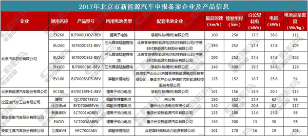 北京市場是全國新能源汽車推廣的重要陣地,也是全國新能源汽車發(fā)展的一個風(fēng)向標(biāo)。從北京市新能源汽車目錄公示信息我們可以知道,2017年,寧德時代、比亞迪、孚能科技(贛州)這些電池企業(yè)的產(chǎn)品在北京市場占有重要分量,磷酸鐵鋰和三元電池在新能源乘用車中也占據(jù)大半壁江山;電池能量密度超過120Wh/kg的并不多,續(xù)駛里程、百公里耗電等指標(biāo)均比往年有所提高。