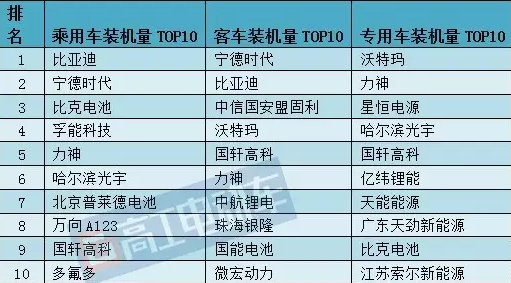 分領(lǐng)域看,在乘用車、客車和專用車領(lǐng)域裝機(jī)量居于首位的動(dòng)力電池企業(yè)分別為比亞迪、寧德時(shí)代與沃特瑪。此外,力神、星恒電源、中信國(guó)安盟固利、哈爾濱光宇、億緯鋰能、中航鋰電、國(guó)能電池、微宏動(dòng)力、廣東天勁、孚能科技、珠海銀隆、江蘇索爾、均等知名電池企業(yè)均憑借良好的成績(jī)出現(xiàn)在前十位的排名榜中。