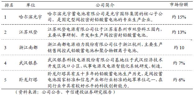 通信用蓄電池市場是高端蓄電池市場,產(chǎn)品技術(shù)含量較高、產(chǎn)業(yè)較為集中,客戶相對穩(wěn)定。公司蓄電池業(yè)務(wù)主要由子公司臥龍燈塔實施,臥龍燈塔是該領(lǐng)域的龍頭企業(yè)之一,占市場份額的6%左右,具有較強(qiáng)的市場競爭力。
