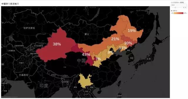 2014至2016年,中國(guó)部分地區(qū)棄風(fēng)呈攀升趨勢(shì),日益惡化:2016年棄風(fēng)總量高達(dá)497億千瓦時(shí),是2014年的4倍!上圖中顏色最深的甘肅、新疆、內(nèi)蒙古、吉林和黑龍江五個(gè)地區(qū),3年棄風(fēng)量就接近800億千瓦時(shí),相當(dāng)于天津市2015年全年的用電量。其中甘肅省的棄風(fēng)率更是從2014的11%飆升到2016年的43%!