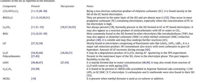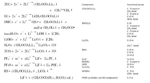 在形成過程中,發(fā)生了如下反應(yīng),生成了LiCO3、(CH2OCO2Li)2等無機(jī)/有機(jī)沉淀物、也生成了H2、C2H4等氣體分子。下表列出了一些常見組成成分。對(duì)于其中成分的分析,主要依靠FITR(紅外)和XPS(X射線光電子能譜分析),分別得到成分和結(jié)構(gòu)信息。