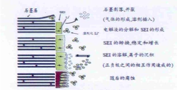 在膜的生長(zhǎng)中,一個(gè)無效的SEI 層是困溶劑化鋰源,可以導(dǎo)致金屬鋰集群的增長(zhǎng)。在不斷增長(zhǎng)的SEI 中,被困的溶劑化鋰離子與電解液反應(yīng),增加表面積累的還原產(chǎn)物的濃度[9],顯著增加電荷轉(zhuǎn)移電阻[10]。在石墨表面積累的還原產(chǎn)物,降低了在SEI 層的孔隙大小,導(dǎo)致減緩了Li+ 的嵌入/ 脫嵌動(dòng)力學(xué)。整個(gè)循環(huán)過程中,SEI膜是不斷變化的,大致如下圖: