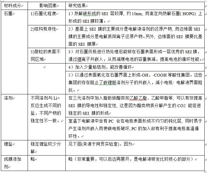 SEI膜的形成主要受到石墨、電解液(溶劑、鋰鹽)的影響,改善也是從這三個(gè)方面進(jìn)行.大致總結(jié)如下,如果是針對(duì)不同的石墨材料(人造石墨、MCMB、中間相微球)、電解液添加劑,展開較多,就不再展開。