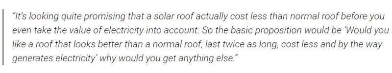 Musk在會(huì)議上說:“看起來很有希望,太陽能屋頂比傳統(tǒng)屋頂?shù)某杀靖?,甚至不必考慮發(fā)電帶來的價(jià)值因素。所以我們的銷售可以這樣說:‘這邊有一款屋頂瓦片產(chǎn)品,造型比傳統(tǒng)產(chǎn)品更漂亮、使用壽命是后者的兩倍、價(jià)格比前者更低、而且它還可以發(fā)電,你還會(huì)考慮別的產(chǎn)品么?’”Musk表示,這一進(jìn)展的實(shí)現(xiàn)要?dú)w功于“現(xiàn)有的屋頂供應(yīng)鏈難以置信的低效”。