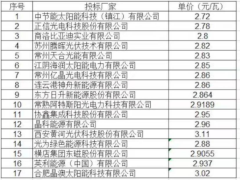中國(guó)儲(chǔ)能網(wǎng)訊:近日,國(guó)電投公布了2017年度組件招標(biāo)價(jià)格情況。據(jù)悉,最低組件價(jià)格2.72元/W,最高3.11元。超過(guò)3元報(bào)價(jià)的企業(yè)只有2家。