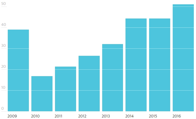 2015年歐盟新增裝機總容量相較前一年降低了5%,然而海上風電發(fā)展勢頭未減反增。由于海上風電耗資相當于陸上風電的兩倍,歐洲范圍內對該領域的投資金額創(chuàng)下了275億歐元的新紀錄。