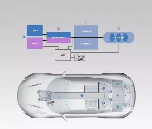 QUANT 48Volt的液流電池是一種介于傳統(tǒng)電池和燃料電池之間的蓄電池,主要是由正負極、隔膜和泵組成,其中正負極被隔膜分開,并分別儲存在各自的電解液儲罐中。含金屬鹽類的電解液被泵入液流電池中,電解液里的金屬離子在正負極間進行交換,發(fā)生電化學(xué)反應(yīng),動力傳動系統(tǒng)便會發(fā)電。并且nanoFLOWCELL強調(diào)該離子液體是液體鹽,它無毒、無害、易燃。