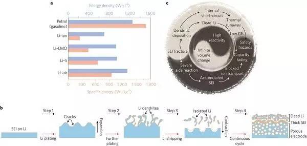 b.鋰剝離/電鍍過程的示意圖。步驟1:鋰電鍍使體積膨脹,SEI膜開裂;步驟2:機(jī)械電鍍使鋰枝晶從裂縫上生長(zhǎng);步驟3:鋰剝離導(dǎo)致孤立鋰的產(chǎn)生,體積變化使SEI進(jìn)一步破裂;步驟4:不斷循環(huán),使1-3步反復(fù)發(fā)生,導(dǎo)致嚴(yán)重的安全問題和容量下降